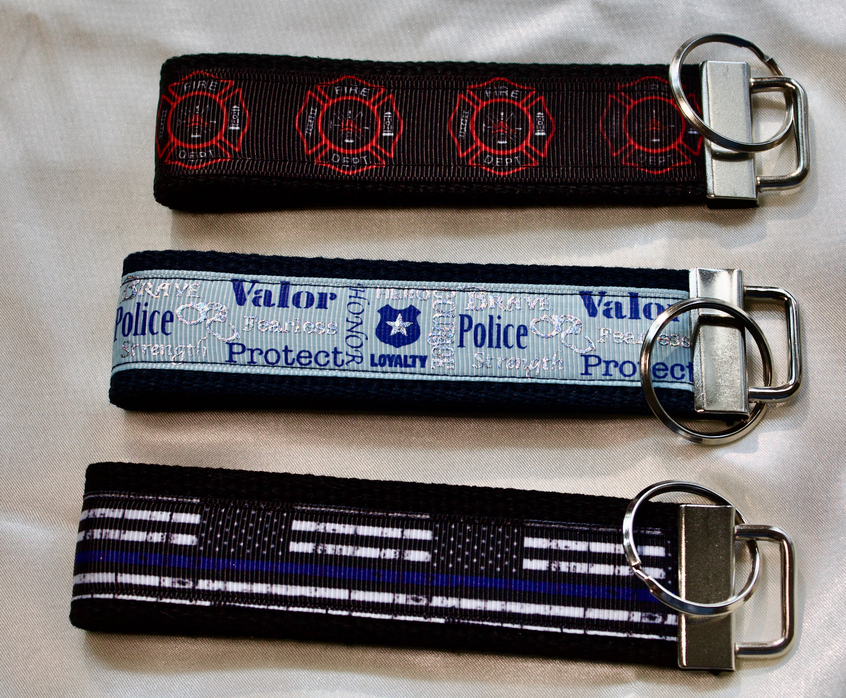 Show some love and appreciation to the hard working professionals that help all of us move through life everyday with one of these fob wristlets. Each fob wristlet is made from heavyweight webbing and stitched beautifully printed ribbon. Size fits most wrists.